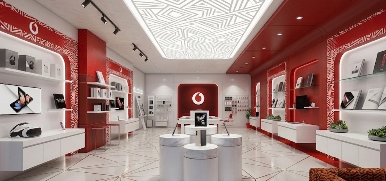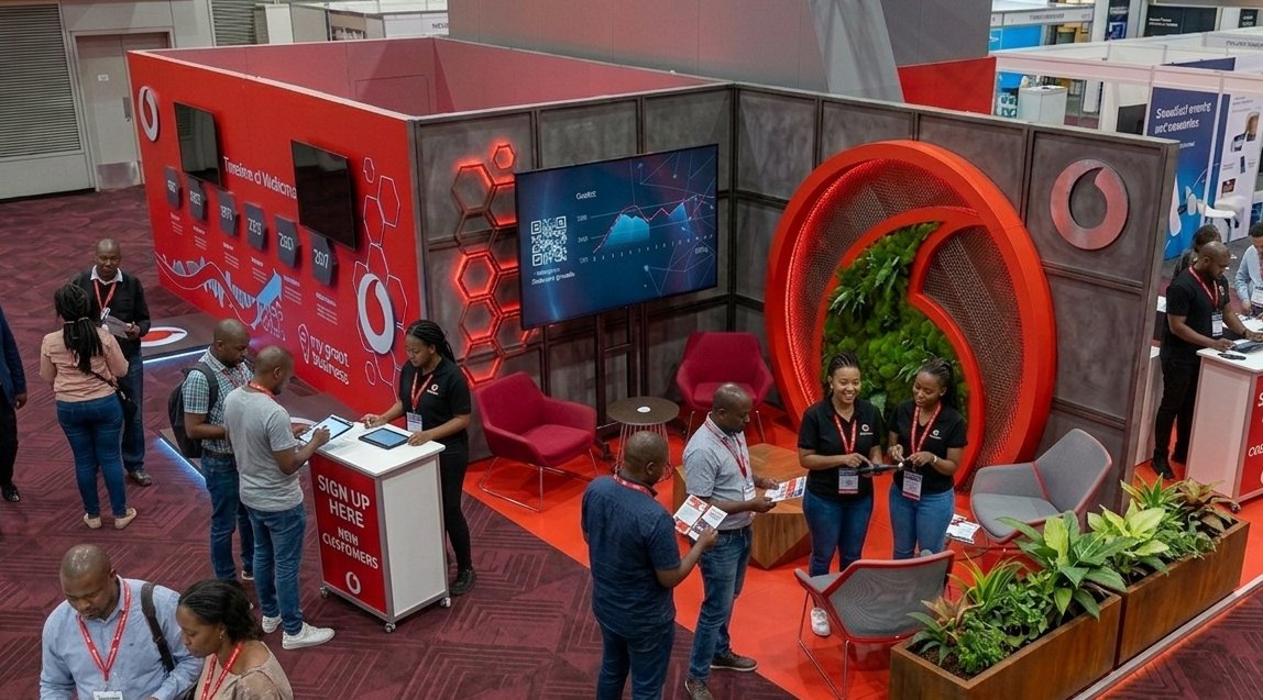 Kasi mural OOH, branded gifting, exhibition stand and flagship retail store interior — all in Vodacom red.